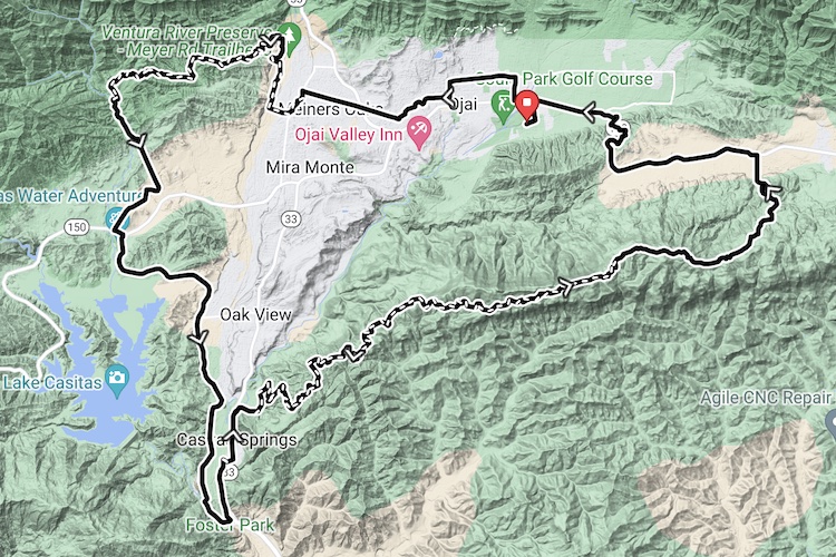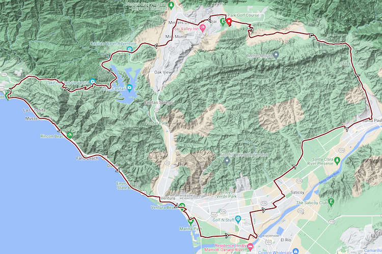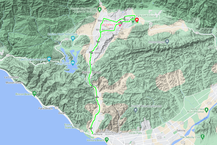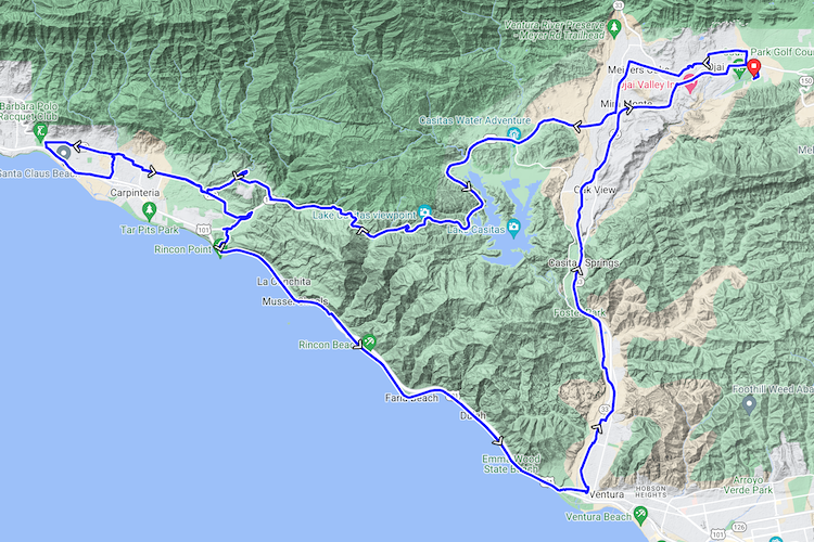 The Metric Century leaves the Soule County Park heading west over Casitas Pass, which is the one major climb on the metric route. This climb is about 4.5 miles long and is mostly about a 5% grade with a few steeper sections. From there the route heads out to Carpinteria and then down the coast to Ventura. From Ventura the route heads up a very gradual grade back into Ojai via the Ojai Bike Trail. The estimated maximum elevation is approximately 1,200 feet, while the total elevation gain is about 3,400 feet.