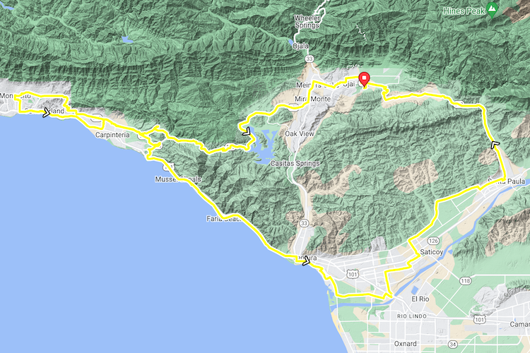 The Full Century heads west over Casitas Pass over many of the same roads used by the Amgen Tour of California. The ride continues on through Carpinteria, Montecito and Summerland before heading south along the coast to Ventura and eventually Santa Paula where you will connect with highway 150 to upper Ojai and down the twisty Dennison Grade back into town. The max elevation is approx 1,600 feet, while the total elevation gain is approximately 5,300 ft.